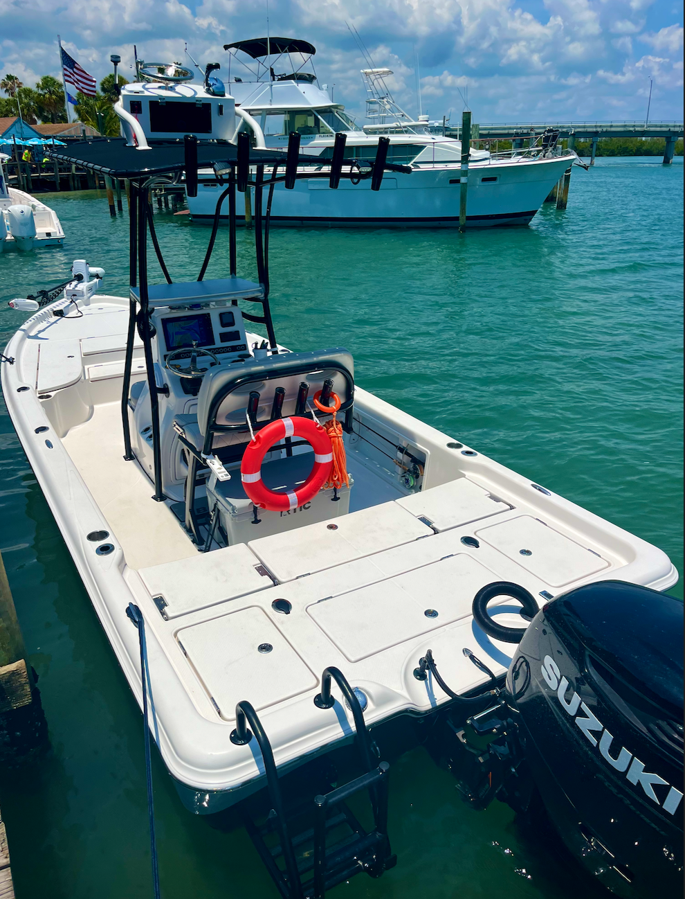 The Fly Boatworks F-18x build by Mark Fisher (founder of Beavertail Skiffs) is a pure push polling fishing machine. Powered by a Yamaha F40 tiller it can run super shallow and floats literally in nothing. Perfect tool for the serious fly fisherman (or woman) who want to experience sight fishing our flats and backwaters.